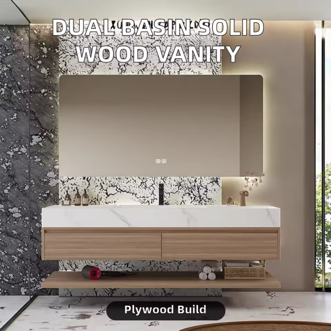 Modern Wall-Mounted Bathroom Vanity Set. This modern wall-mounted bathroom vanity set is a sophisticated and highly functional addition to any contemporary bathroom. This complete set features a sleek wooden cabinet with a luxurious marble top, paired with an illuminated LED mirror for optimal lighting and a striking aesthetic. Designed for wall-mounted installation, it offers a space-saving solution ideal for various bathroom layouts. The unit emphasizes an “Easy Clean” feature, ensuring practicality alongside its modern design. With its focus on graphic design and overall project solutions, this vanity set is perfect for enhancing modern residential and hospitality spaces.