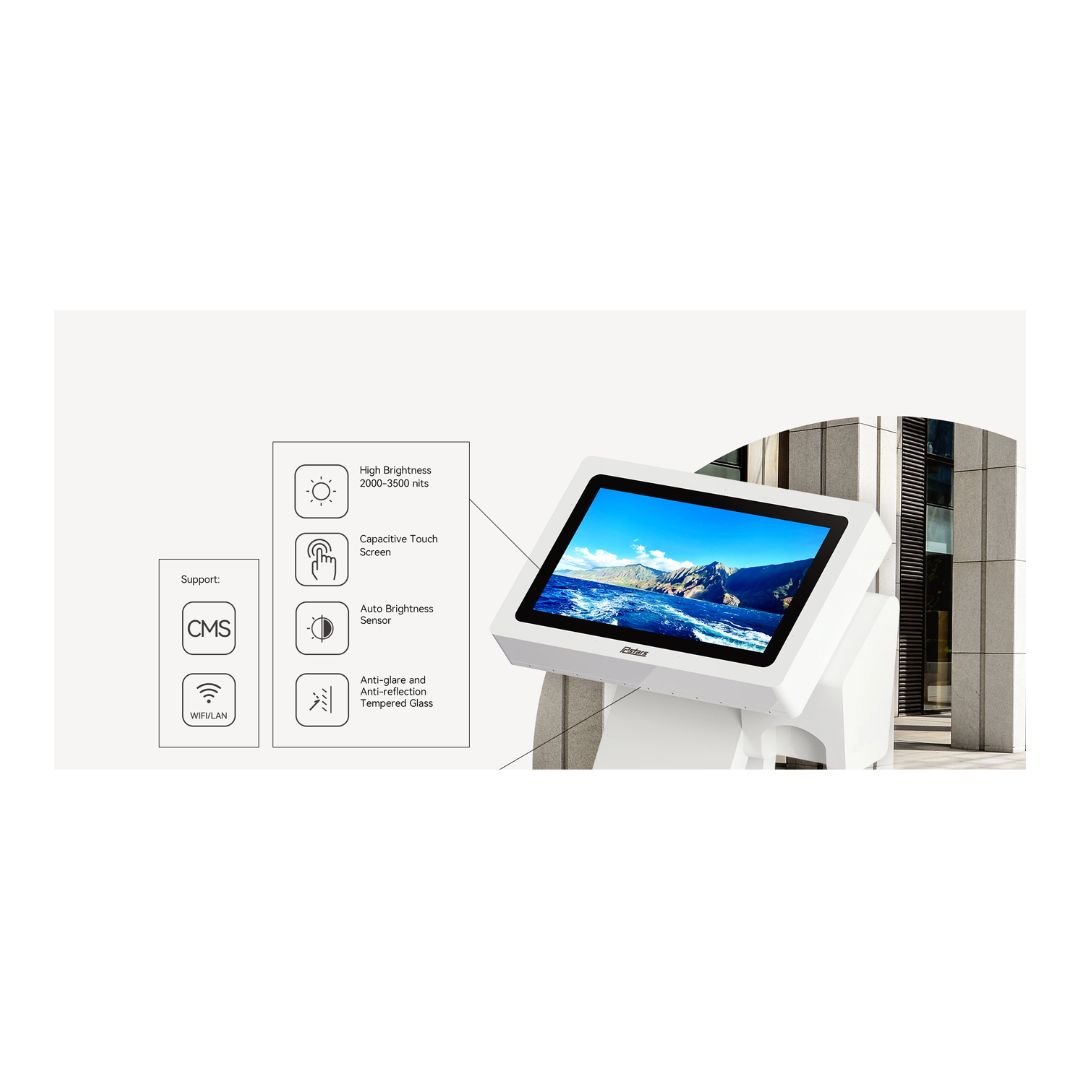 Outdoor Interactive Information Self Service Kiosk 23.8 inch. The 23.8 inch Outdoor Interactive Information Kiosk ARL-RCS-240ODK is an outdoor digital self-service information kiosk designed to meet IP65 requirements, ensuring durability in various outdoor conditions. It features an ultra-high screen brightness of 2000-3500 nits and a precise capacitive touch screen for optimal visibility and interaction. With multiple security protections and high working performance, this outdoor digital signage kiosk is a robust solution. Additionally, it supports Wi-Fi/LAN connectivity and utilizes a CMS system for convenient online centralized update management.