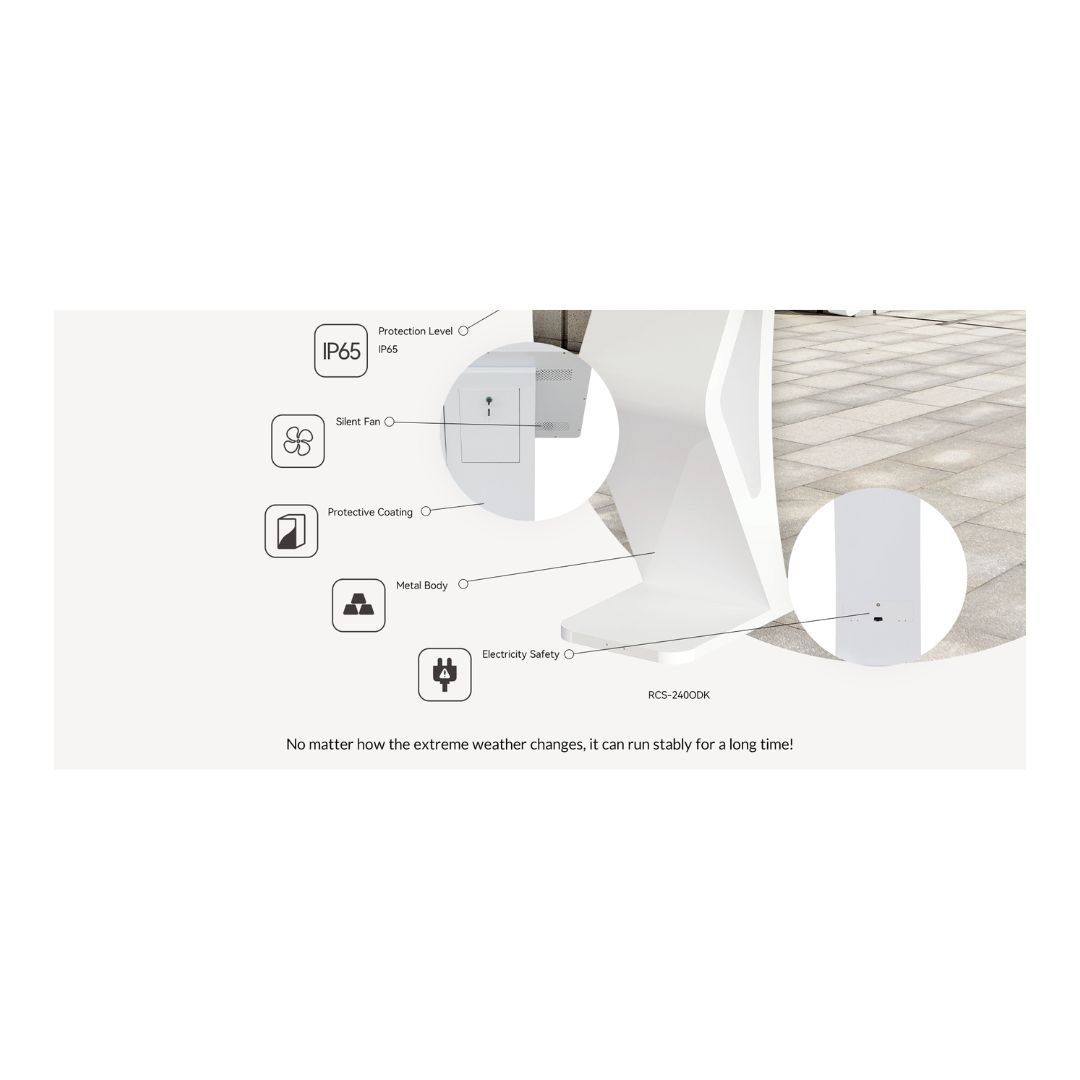 Outdoor Interactive Information Self Service Kiosk 23.8 inch. The 23.8 inch Outdoor Interactive Information Kiosk ARL-RCS-240ODK is an outdoor digital self-service information kiosk designed to meet IP65 requirements, ensuring durability in various outdoor conditions. It features an ultra-high screen brightness of 2000-3500 nits and a precise capacitive touch screen for optimal visibility and interaction. With multiple security protections and high working performance, this outdoor digital signage kiosk is a robust solution. Additionally, it supports Wi-Fi/LAN connectivity and utilizes a CMS system for convenient online centralized update management.