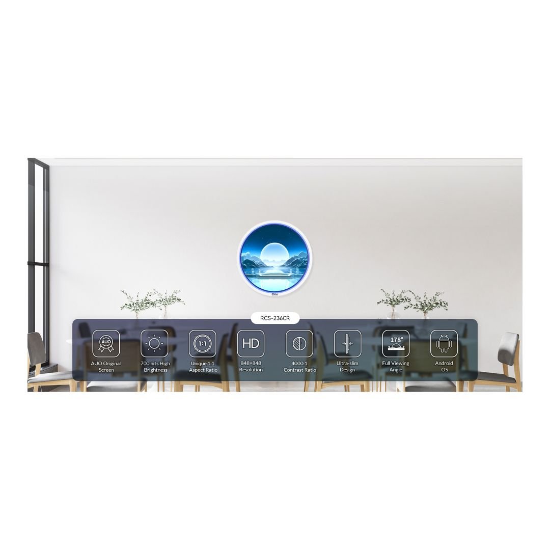 Personalized Circular LCD Screen Advertising Player 23.6-inch. The ARL-RCS-236CR is a cutting-edge 23.6-inch circular LCD screen advertising player designed for dynamic visual experiences. It features an AU original screen with a unique 1:1 aspect ratio, restoring true human eye perception. Encased in a rugged, ultra-slim aluminum alloy housing with a professional industrial spraying RC-1162 white coating, this player offers both durability and a sleek aesthetic. Ideal for diverse advertising scenarios, it boasts unmatched display quality with 700 nits brightness and a 4000:1 contrast ratio, ensuring clear and vivid content even in challenging lighting.