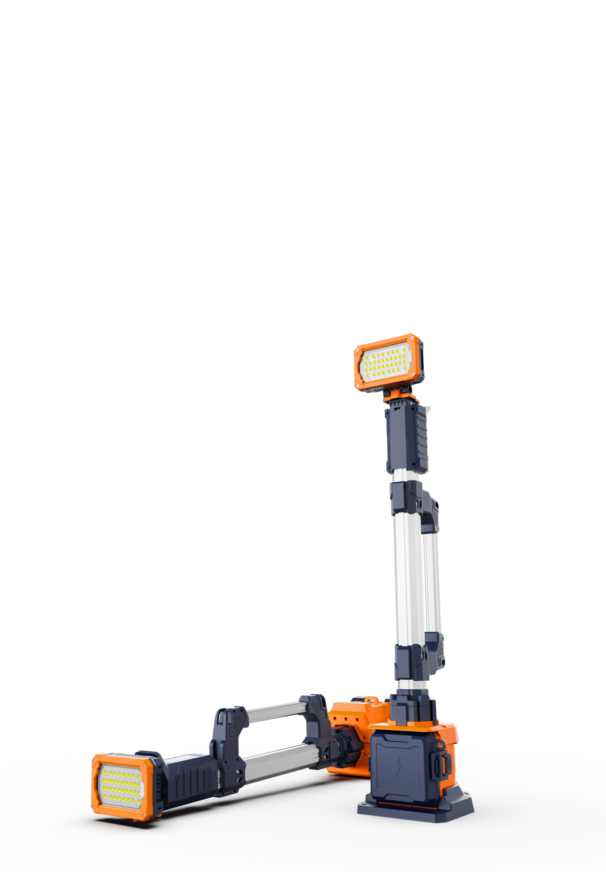 The Portable Light Tower ARL-TL-100 is a deployable portable lighting solution in one robust package. It is designed for one-second operation, allowing for quick expansion or collapse. The lamp head can be raised to 1.4m with a simple grab and lift, and it can be reset and locked with a tap down. The light head is freely adjustable with built-in damping for tool-free adjustment and a finely-tuned tactile feel.