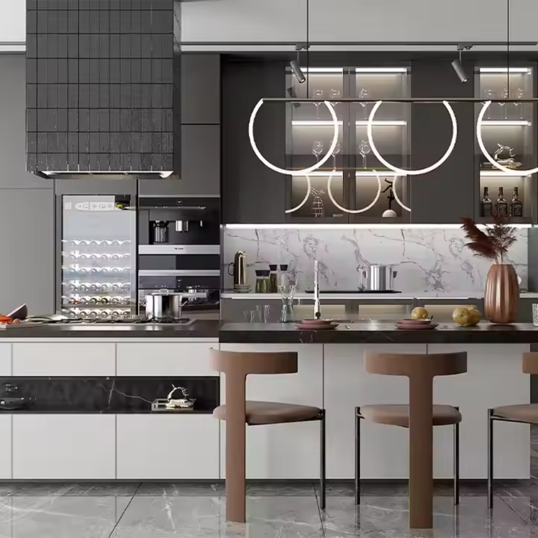 • Integrated Island: Enhances functionality, providing additional countertop space and a central workstation.