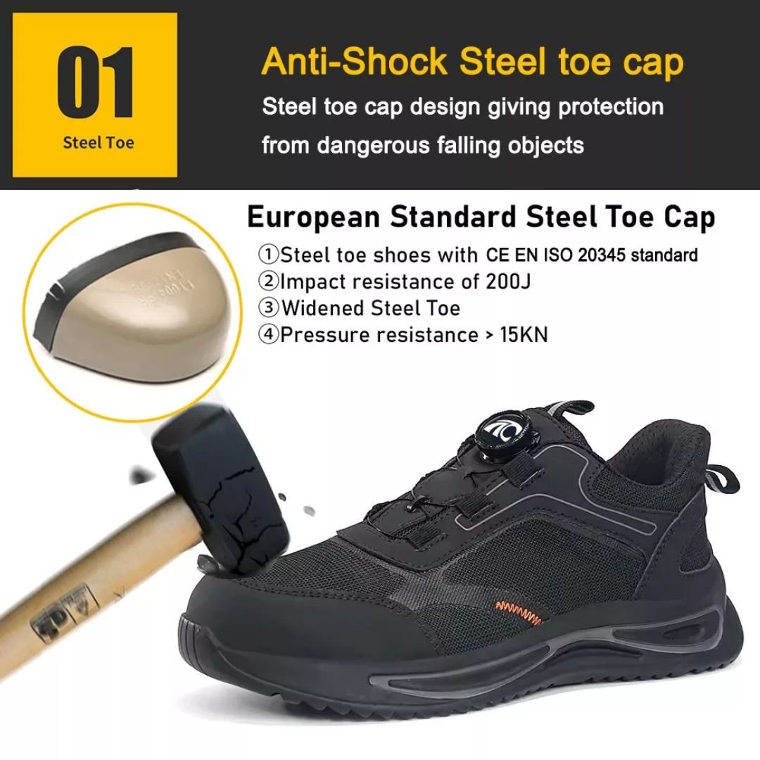 - Toe Cap: Steel toe cap for impact resistance, meeting CE standards.