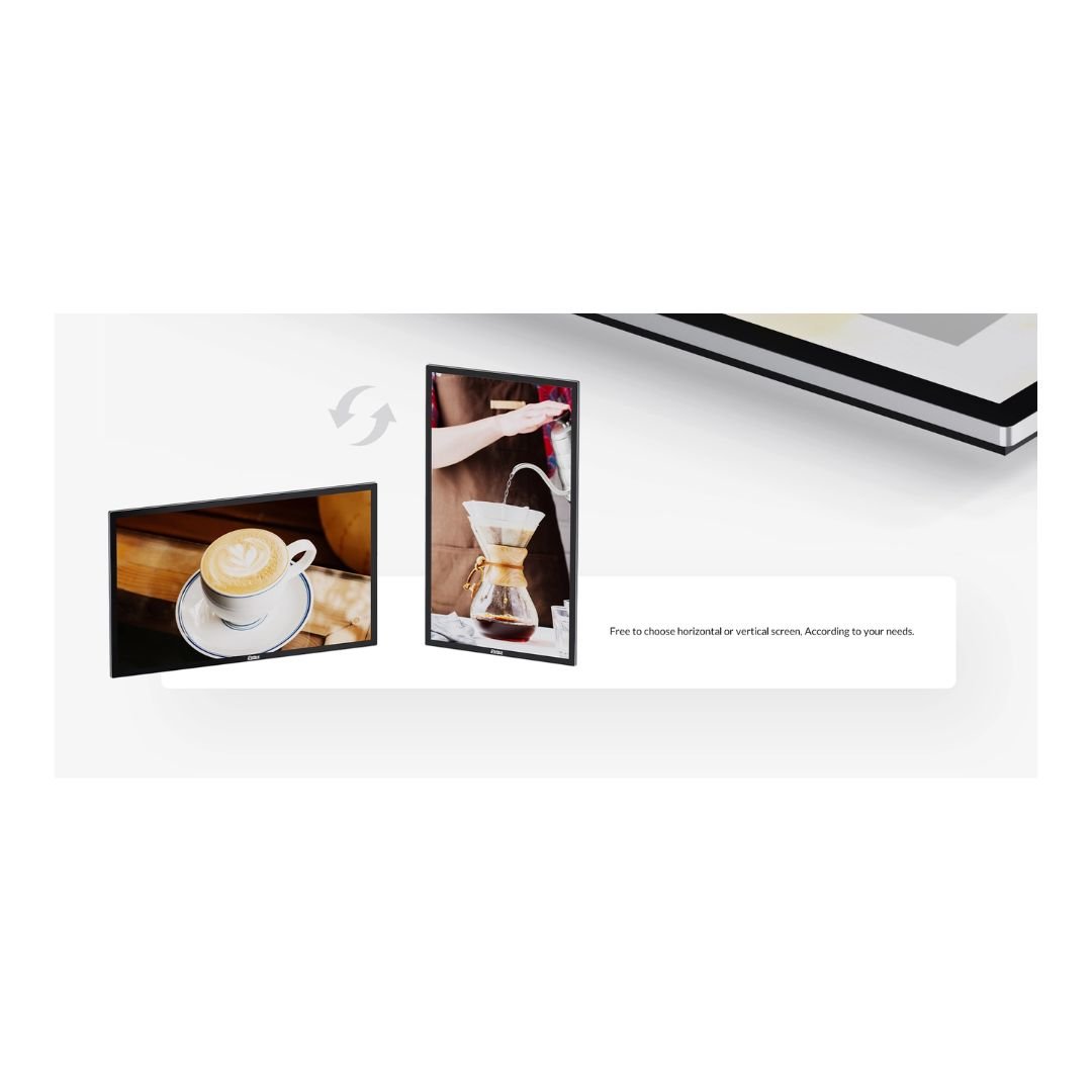 Ultra-Thin Hanging Display. The Ultra-Thin Hanging Display ARL-RCS-101J to RCS-650J offers a sleek and elegant design with popular iPhone rounded corners and an ultra-thin body, featuring a silver aluminum profile and a metal back for superior heat dissipation. This versatile display is available with optional touch screen capabilities (Capacitive or IR touch) and supports multiple operating systems including Android, LCD Monitor, Plug & Play, and Windows. With flexible horizontal or vertical screen orientation and a wide range of mounting brackets, the Ultra-Thin Hanging Display ARL-RCS-101J to RCS-650J is suitable for a variety of applications, combining the latest Android media player technology for faster content updates and better visual effects.
