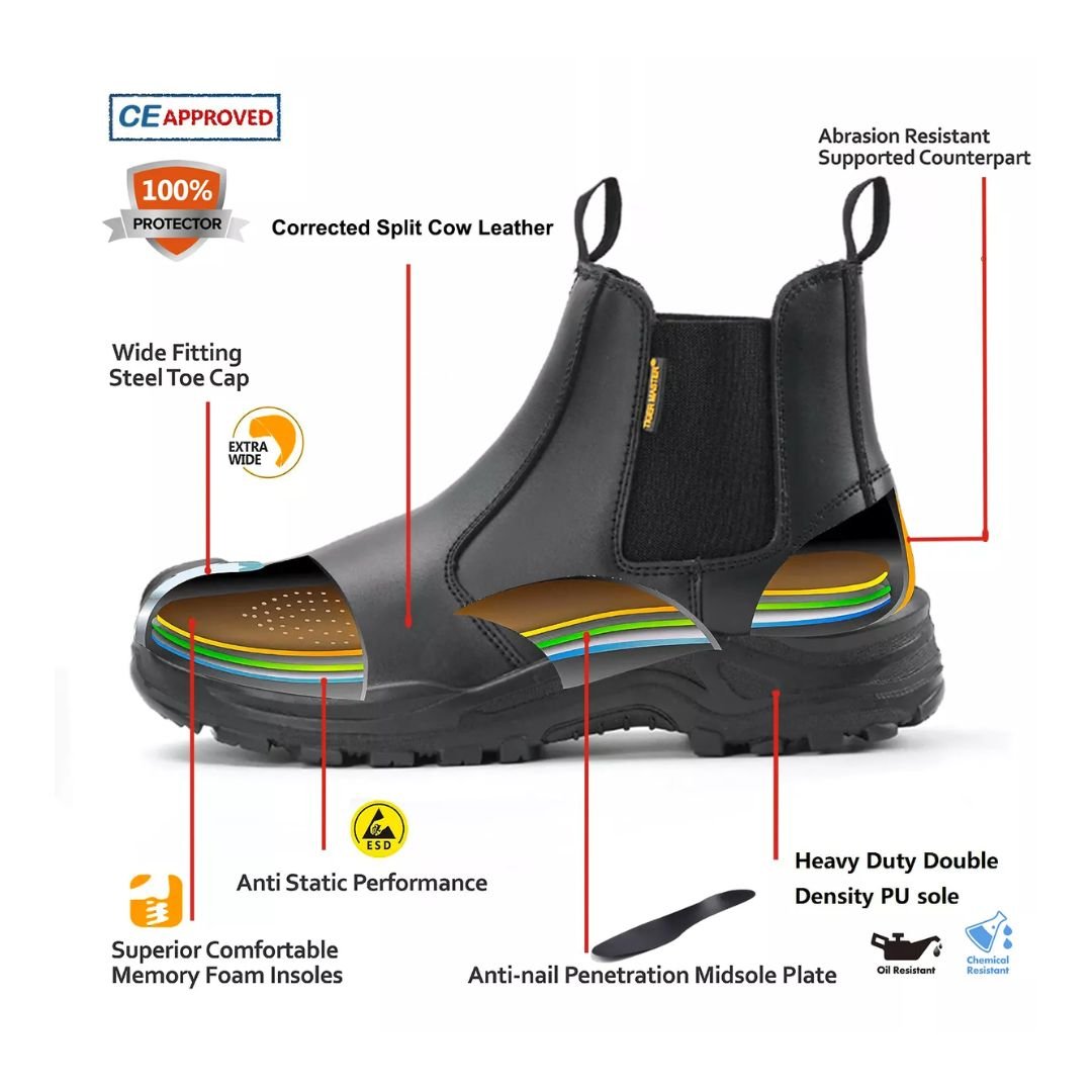 The Steel Toe Puncture Proof Anti Static Safety Shoes Leather without Laces ARL-TM3325 are robust and convenient middle-cut safety shoes, designed for demanding work environments where a lace-free design is preferred for ease of use and to prevent snagging. Constructed with an injection-moulded method, these slip-on shoes feature an upper made from durable corrected cow leather. The sole is a dual-density PU, providing a balance of cushioning and excellent slip resistance. For enhanced comfort, the lining is made of soft mesh fabric (also specified as soft air mesh fabric), and the insoles are moulded HI-POLY coated with mesh fabric. These safety shoes are equipped with a steel toe cap and a steel mid-sole, meeting CE EN ISO 20345 S3 SRC standards. These shoes are ideal for construction sites, industrial settings, and general indoor work where reliable foot protection and a slip-on design are essential.