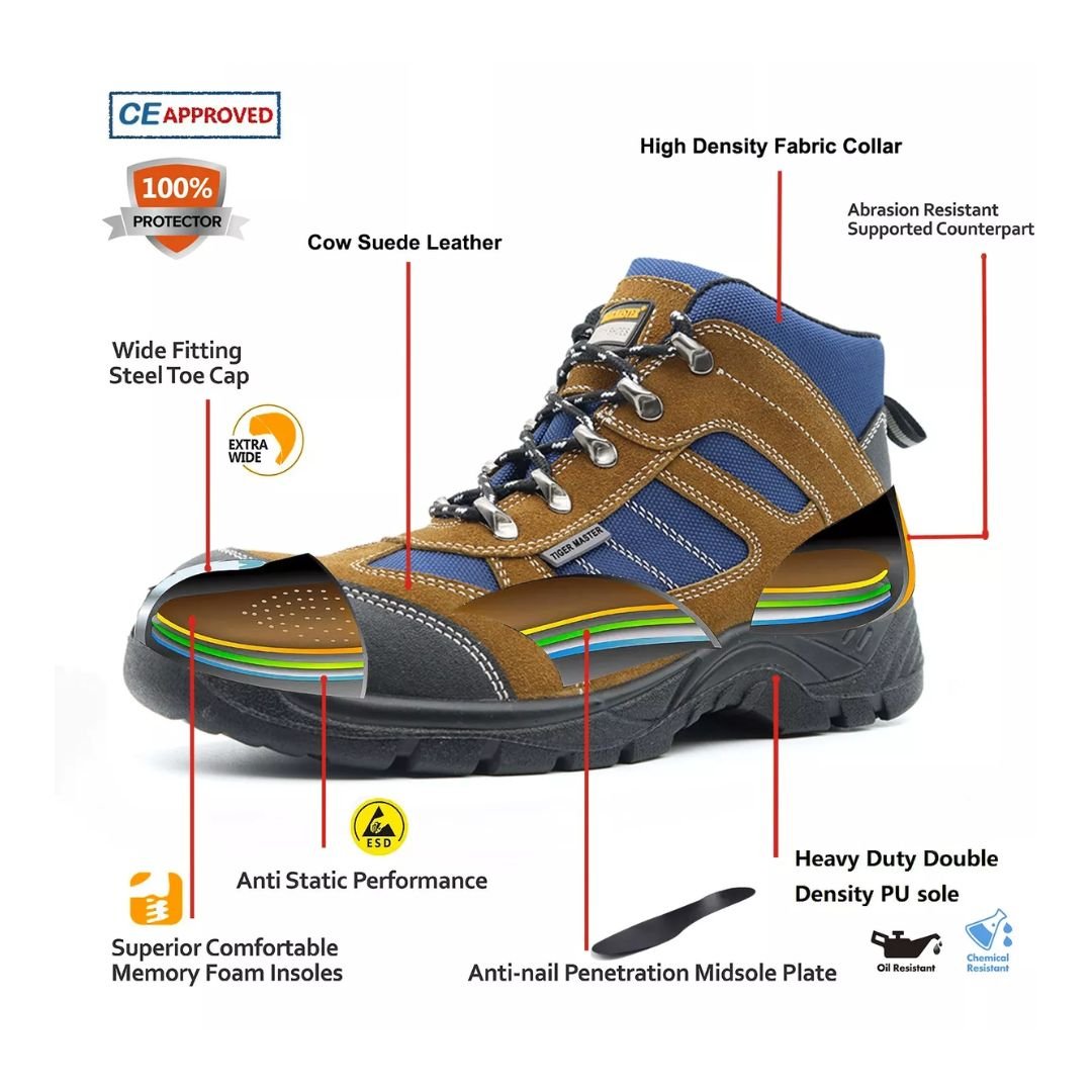 The Steel Toe Steel Mid-sole Suede Safety Shoes Brown ARL-TM219-A are durable and comfortable middle-cut safety shoes designed for various work environments. Constructed with an injection-moulded method, these lace-up shoes feature an upper made from supple cow suede leather in a practical brown color. The sole is a dual-density PU, providing a balance of cushioning and excellent slip resistance. For enhanced comfort during long work hours, the lining is made of soft mesh fabric, and the insoles are moulded EVA coated with mesh fabric. These safety shoes are equipped with a steel toe cap that is impact-resistant up to 200 joules and a steel mid-sole that offers puncture resistance up to 1100 newtons, meeting CE EN ISO 20345 S1-P SRC standards. These shoes are ideal for construction sites, industrial settings, warehouses, and various other work environments where foot safety is crucial.
