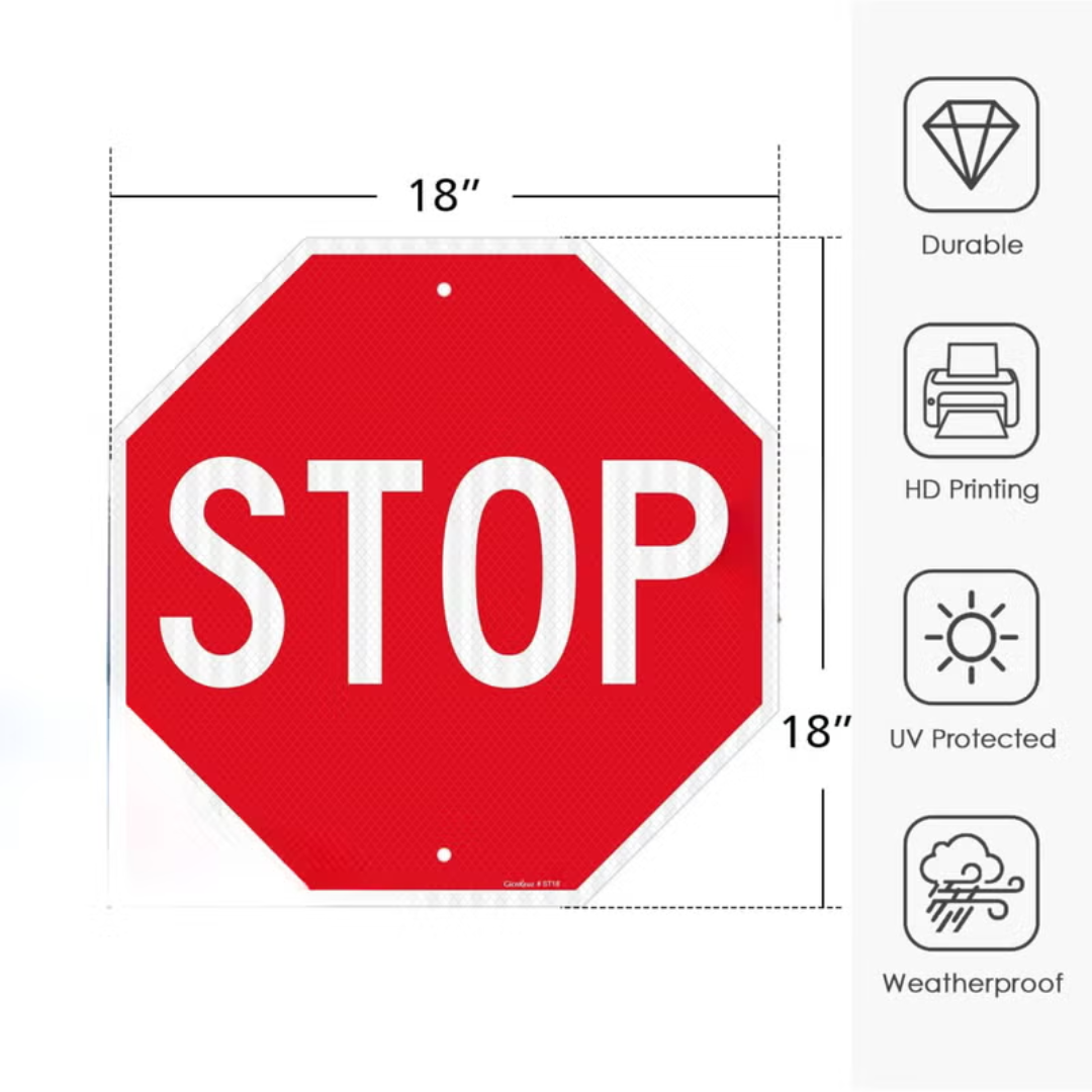 STOP Traffic Sign ARL-SSA. Ensure clear and undeniable traffic control with this professional-grade “STOP” sign. Measuring 18 x 18 inches (approximately 45.72 x 45.72 cm), this octagonal sign features high-intensity Engineer Grade reflective aluminum sheeting, providing exceptional visibility day and night, even in low-light conditions. Built to withstand the elements, it is rust-free, weather-resistant, and waterproof, ensuring long-lasting performance without fading. This sign is ideal for private roads, parking lots, residential areas, and construction zones, or any location requiring a clear and durable stop indication to enhance safety and manage traffic flow effectively.