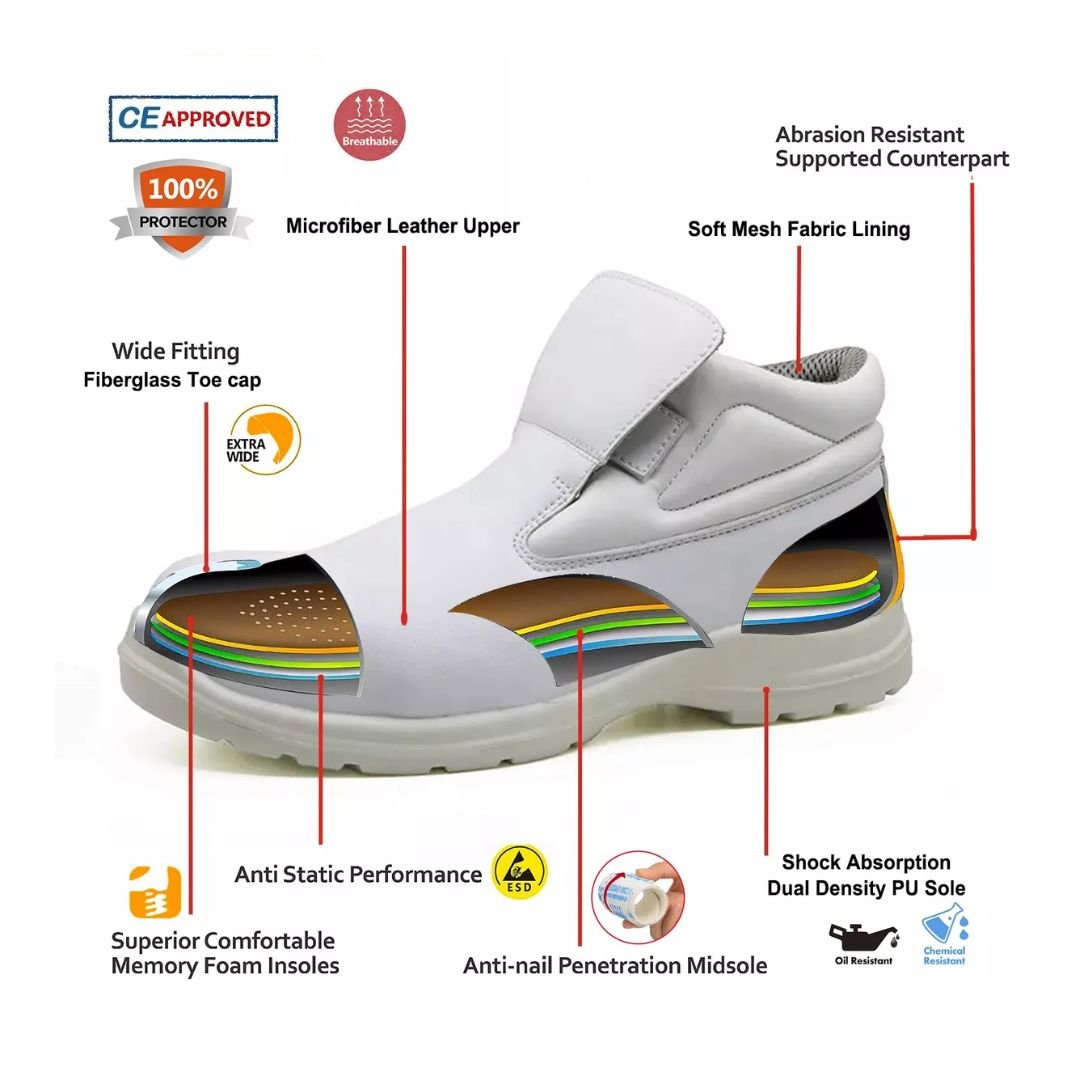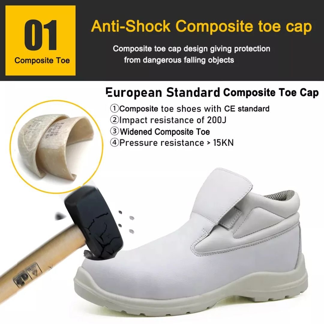 The White Fiberglass Toe Chef Kitchen Safety Shoes ARL-TM057 are mid-cut safety shoes specifically designed for the food industry, including restaurants, kitchens, & food service. These white, lightweight, & metal-free shoes prioritize hygiene, comfort, & crucial protection in environments where slips & punctures are common hazards. Constructed with an injection-moulded method, these lace-up shoes feature an upper made from durable microfiber leather, known for its ease of cleaning, comfort, flexibility, & resistance to dust & wind. The sole is made of PU dual density, providing excellent cushioning, shock absorption, & reliable slip resistance, meeting CE EN ISO 20345:2022 Non-Slip Testing Standards. For enhanced comfort, the lining is made of soft air mesh fabric, & the insoles are moulded EVA (or HI-POLY) coated with mesh fabric. The collar is made of PU artificial leather. These safety shoes are equipped with a lightweight fiberglass toe cap & a flexible aramid fiber mid-plate fully meeting CE EN ISO 20345 S1-P SRC standards.