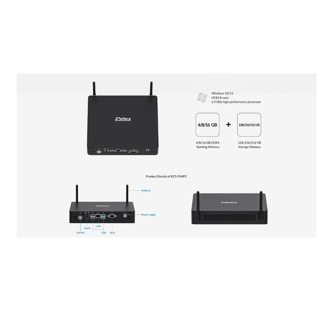 Windows Digital Signage Media Player Box. The ARL-RCS-904PC is a powerful Windows-based Digital Signage Media Player Box, engineered to maximize your digital world. Featuring a unique quick-disconnect PC design and multiple I/O ports, this player delivers seamless performance for a wide range of applications, including gaming machines, hospitality systems, industrial automation, interactive kiosks, point-of-sale systems, and retail displays. With its robust Windows 10/11 operating system and high-performance processor, it ensures your content runs smoothly and efficiently without freezing or buffering.